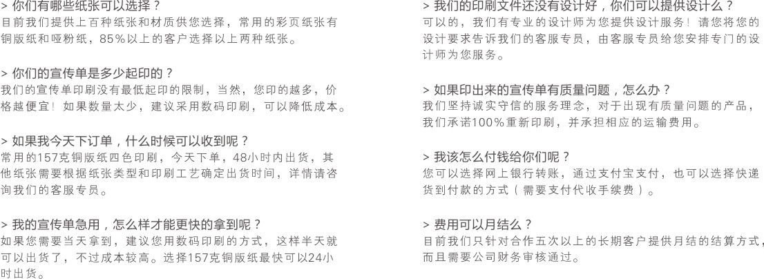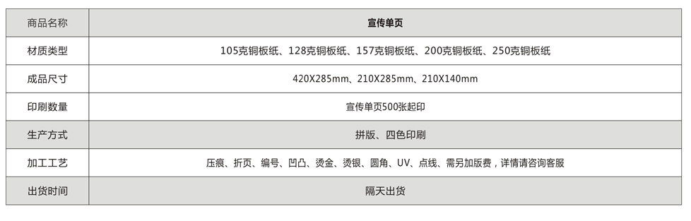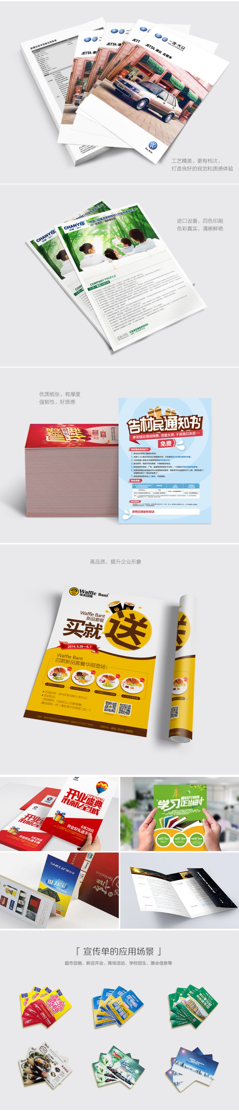 1、客户需提供可印刷电子文件,如需彩页设计,彩页制作每款加收费用; 2、彩页后加工可选择对折/荷包折/风琴折/复膜等.